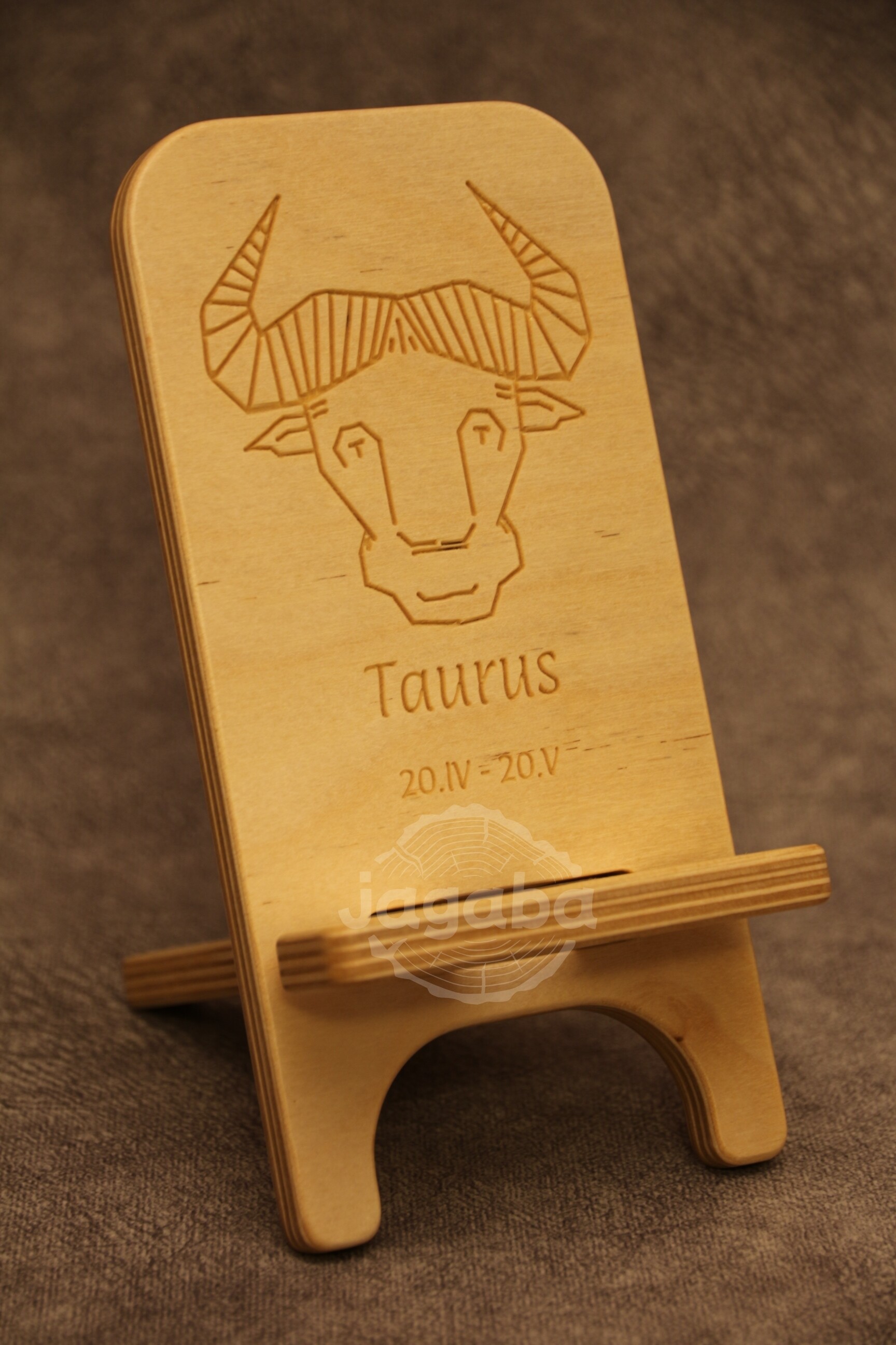 Stojak na telefon ze sklejki brzozowej z wygrawerowanym znakiem zodiaku - Bykiem. Jeśli nie jesteś zodiakalnym bykiem, a podoba Ci się nasz stojak napisz do nas.